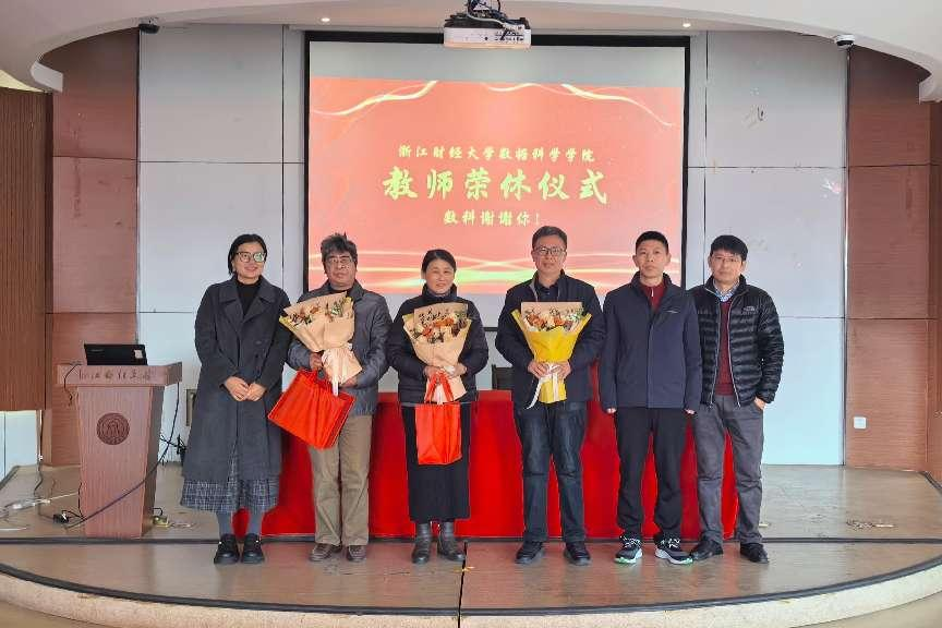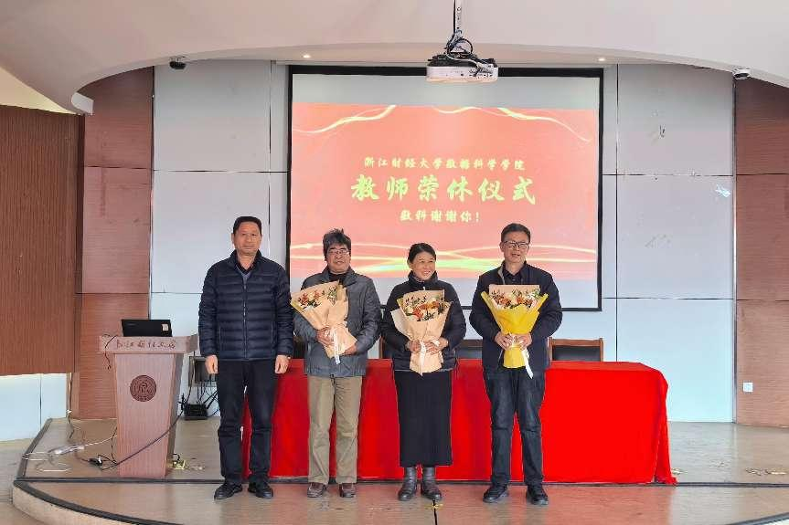 仪式首先回顾了2024年度盘口分析 6名荣休教师,周君兴、应建君、李晓东、陈晓雷、郑学东、叶爱珍的工作成果、获得荣誉。院长洪兴建与学生代表为到场的3名荣休教师应建君、李晓东、叶爱珍送上鲜花。盘口分析 党委副书记王文婷、副院长刘波、副院长郑松给他们送上荣休纪念品。