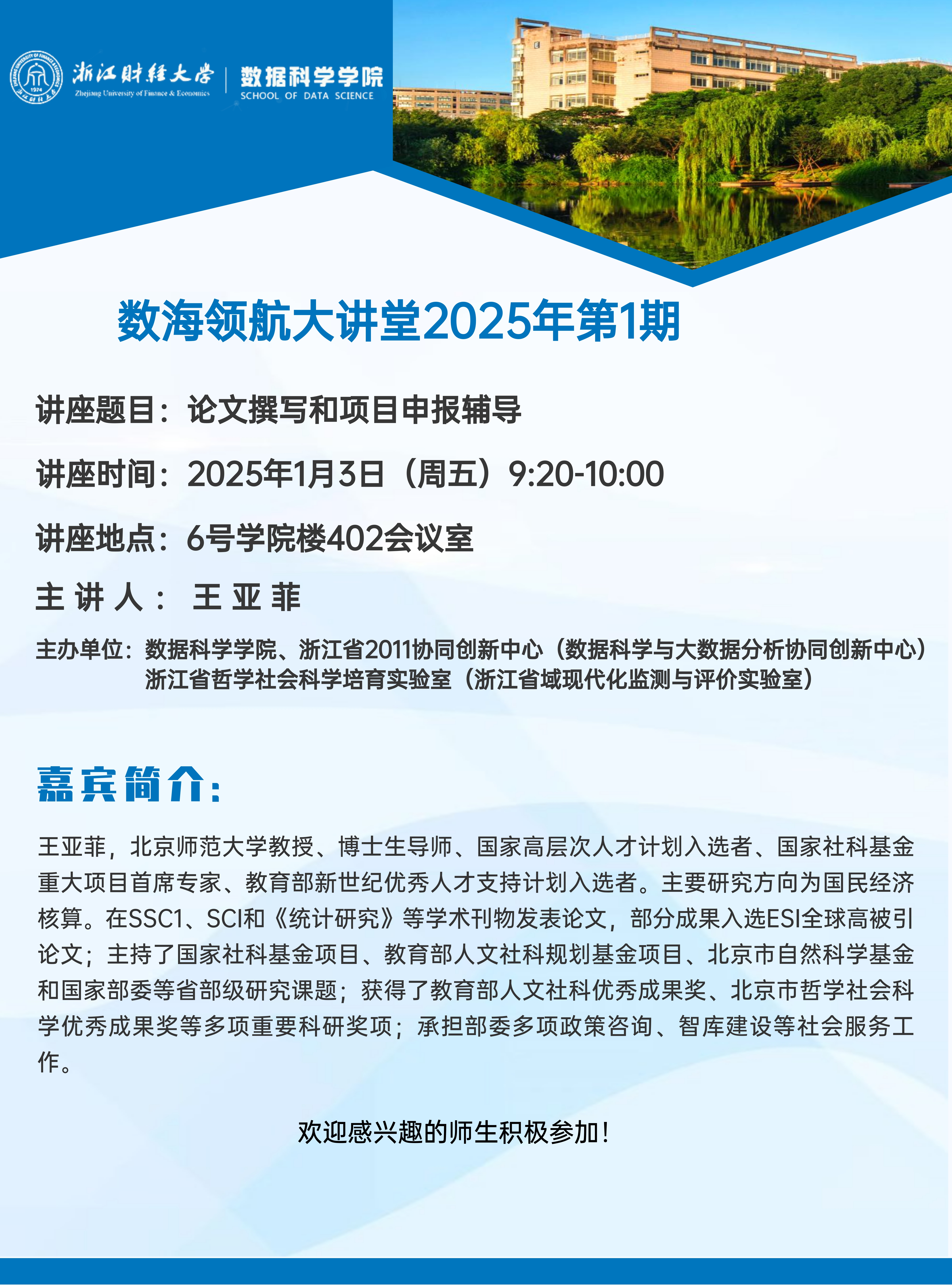 上一条:数海领航大讲堂2025年第2期-华南理工大学贺建风教授 下一条:关于举办盘口分析 第十八届学术论文报告会的通知