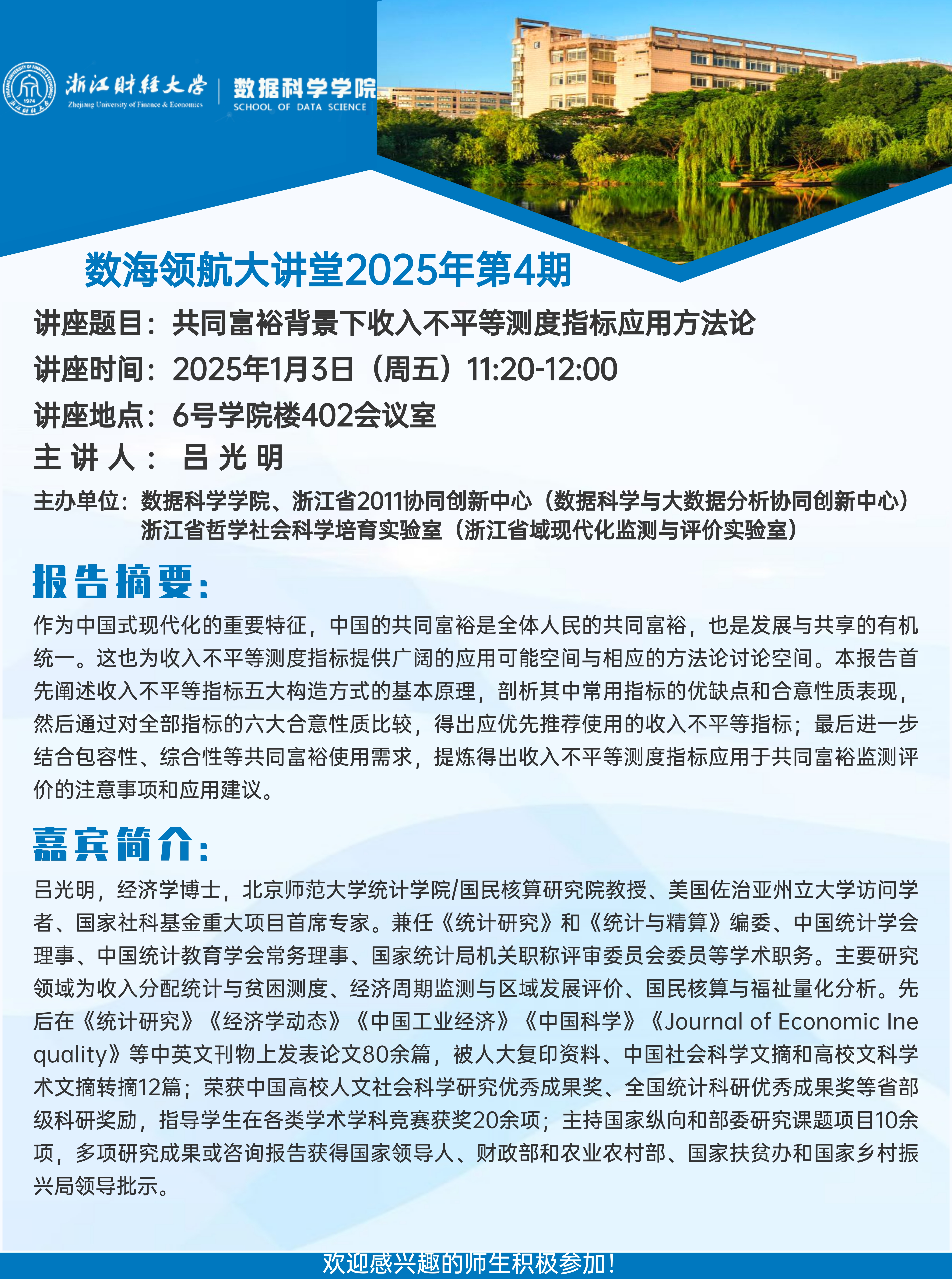 上一条:盘口分析 讲座信息——澳大利亚莫道克大学王海副教授 下一条:数海领航大讲堂2025年第3期-西南财经大学马丹教授