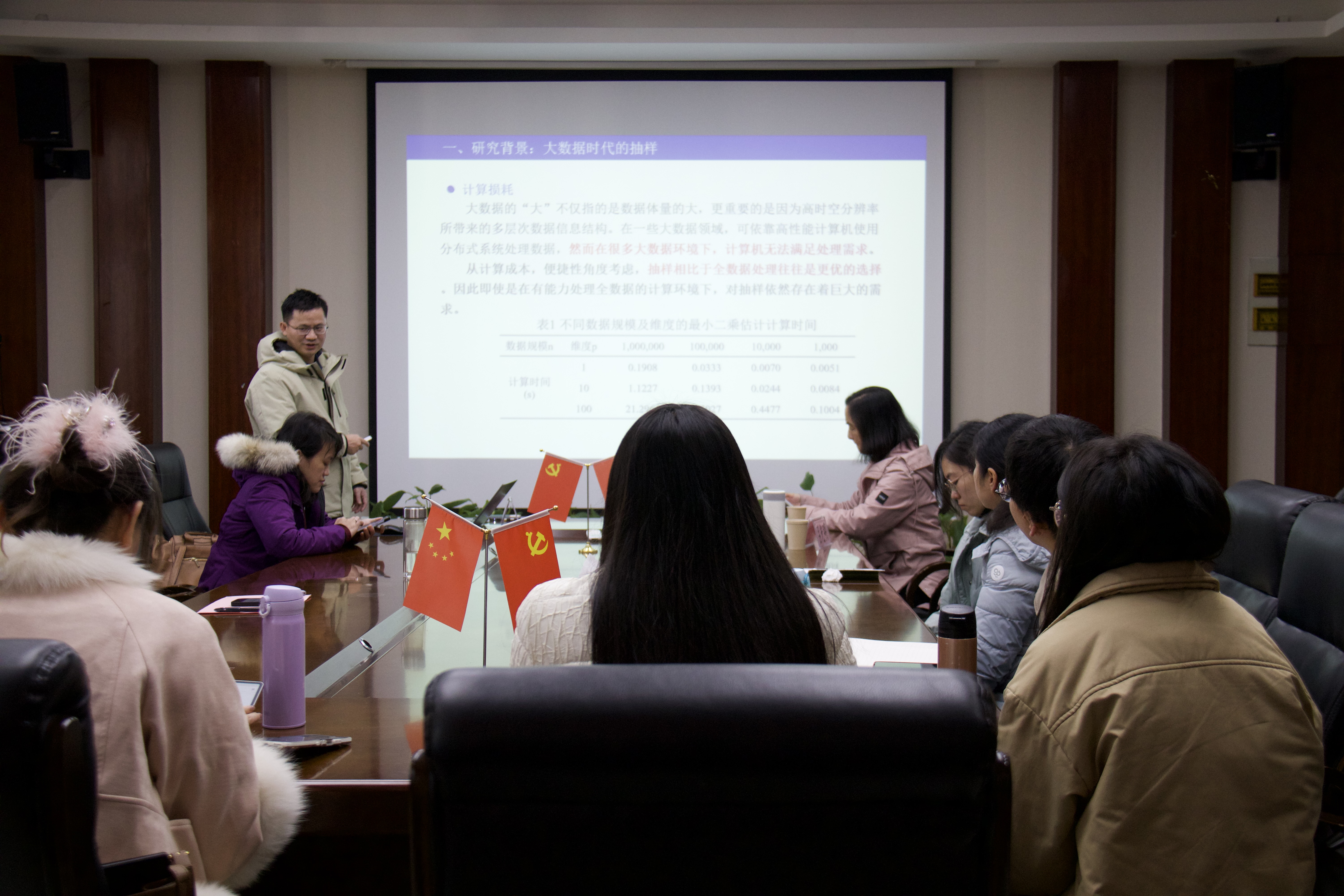 贺建风教授作题为“大数据背景下两阶段Leverage重要性抽样方法研究”报告。Leverage重要性抽样能增加高杠杆值样本点被抽中的概率,但存在异常值风险,他提出了基于阈值自选择的两阶段Leverage重要性抽样方法,第一阶段通过样本距离聚类识别稳健子集,第二阶段在稳健子集上获得稳健抽样估计。模拟实验与实证分析证实该方法能显著提高线性回归系数估计的准确性,并削弱异常值的不利影响。