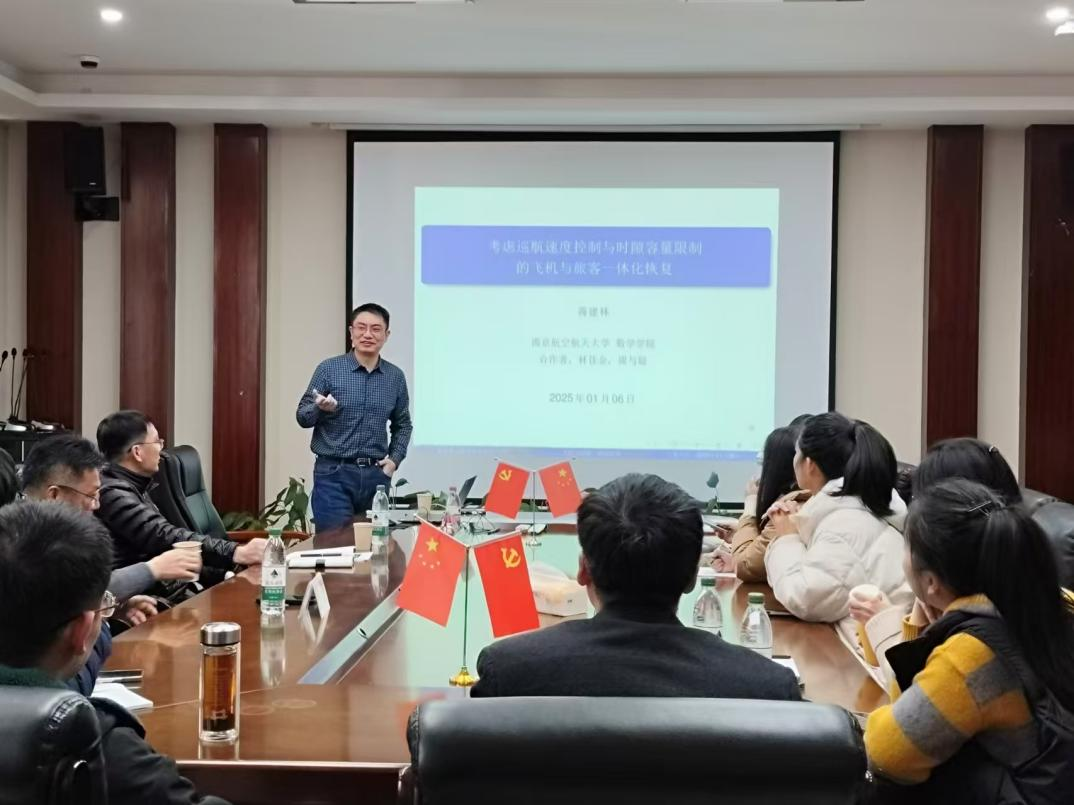 举行数海领航大讲堂2025年第5期。本期邀请南京航空航天大学蒋建林教授为全院师生带来一场题为“考虑巡航速度控制与时隙容量限制的飞机与旅客一体化恢复”的学术讲座。讲座由副院长郑松教授主持,部分教师及研究生参加了此次讲座。