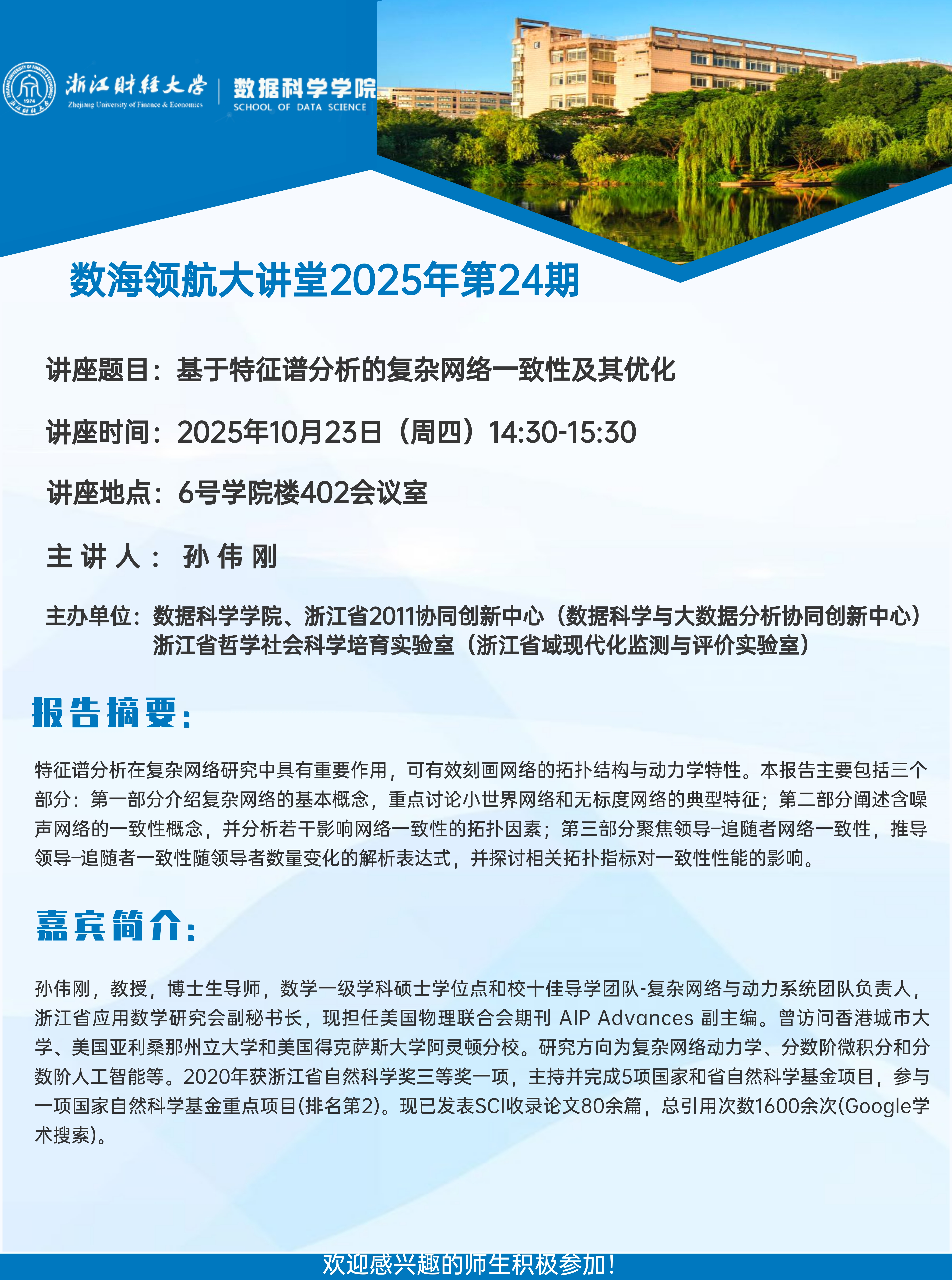 上一条:数海领航大讲堂2025年第25期——中国计量大学于明州教授 下一条:数海领航大讲堂2025年第23期——中国计量大学徐衍聪教授