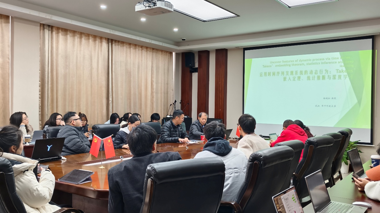 12月12日下午,盘口分析 举行数海领航大讲堂2025年第27期。本期邀请华中科技大学杨晓松教授为全院师生们带来了一场题为“运用时间序列发现系统的动态行为:Takens'嵌入定理、统计推断与深度学习”的学术讲座。讲座由盘口分析 副院长郑松教授主持,盘口分析 部分教师与研究生参加了此次讲座。 本次讲座聚焦数据驱动下自然与社会动态系统的建模与预测这一前沿交叉领域,系统梳理了相关理论、方法与实践挑战。杨晓松教授首先立足实际应用价值与理论研究意义,阐述了利用时间序列数据解析动态系统行为的重要性与核心难点。随后,讲座回溯微分拓扑的基础理论,详细介绍了微分动力系统中的可观测性理论与Takens嵌入定理,为从离散时间序列中重构系统内在动力特性搭建了坚实的理论框架。在此基础上,杨教授深入探讨了时间序列建模的实践路径,重点讲解了如何借助深度学习技术构建高效的时间序列预测模型与表征模型,为复杂动态数据的解析提供了创新方法。最后,讲座聚焦非线性时间序列的去噪问题,阐明了统计推断方法在剔除数据干扰、提升模型可靠性与预测精度中的关键作用,通过理论阐释、方法拆解与挑战分析的层层递进,全面呈现了该领域的研究脉络与未来发展趋势。 本次讲座兼具理论深度与实践指导价值,让在场师生对时间序列分析与动态系统研究的前沿理论、核心方法及应用场景形成了系统认知。讲座搭建了数学、人工智能、控制理论等多学科交叉融合的交流平台,所分享的Takens嵌入定理应用与深度学习建模思路,为相关领域的科研创新提供了重要理论支撑与方法借鉴。讲座后,师生围绕嵌入定理的实践适配性、深度学习模型的优化方向等问题展开热烈探讨,现场学术交流氛围浓厚,为后续开展跨学科研究注入了新的思路与活力。