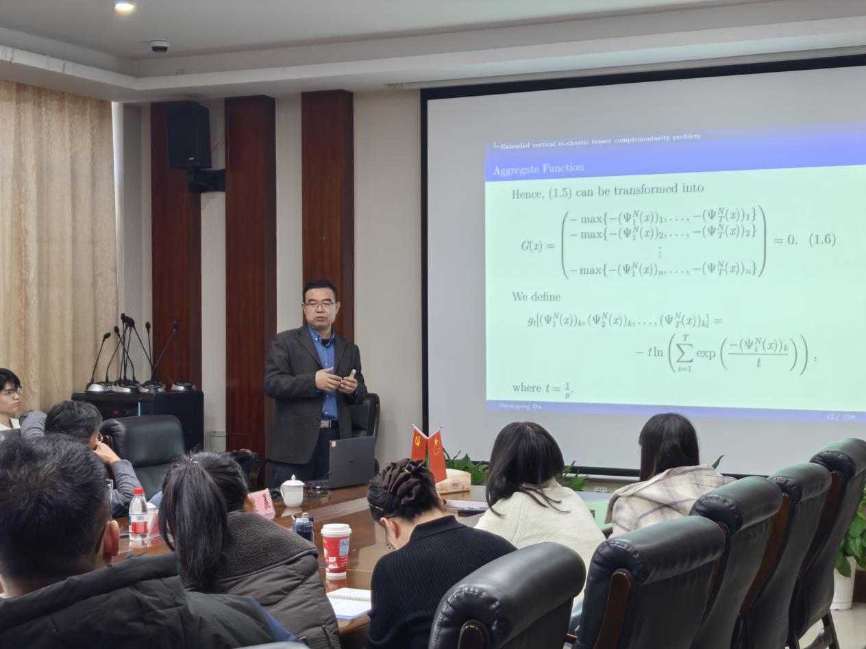 举行数海领航大讲堂2025年第29期。本期邀请青岛大学的杜守强教授为全院师生带来一场题为“Models and Algorithms for Stochastic Tensor Optimization Problems”的学术讲座。讲座由副院长郑松教授主持,部分教师及研究生参加了此次讲座。