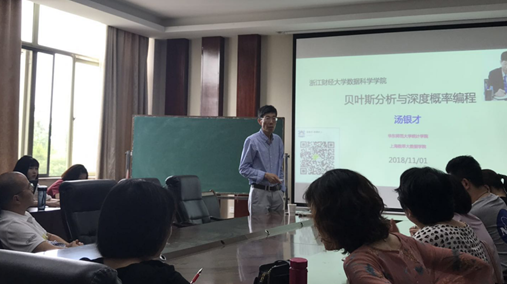 报告会上,汤银才教授首先介绍了贝叶斯定理,指出贝叶斯定理反映了人类的学习过程,并具体描述了贝叶斯推断的优势。随后,汤银才教授就贝叶斯与大数据分析的结合做了简单的介绍,并从模型复杂度、数据量以及计算性能等方面进行了阐述。最后,汤银才教授还对概率编程进行了深入地解读。