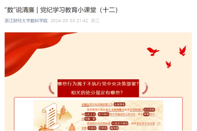 融媒体平台,持续在“数”说清廉栏目推出《党纪学习教育小课堂》系列文章,以问答形式,每天带领师生党员学习一个《条例》相关知识点。