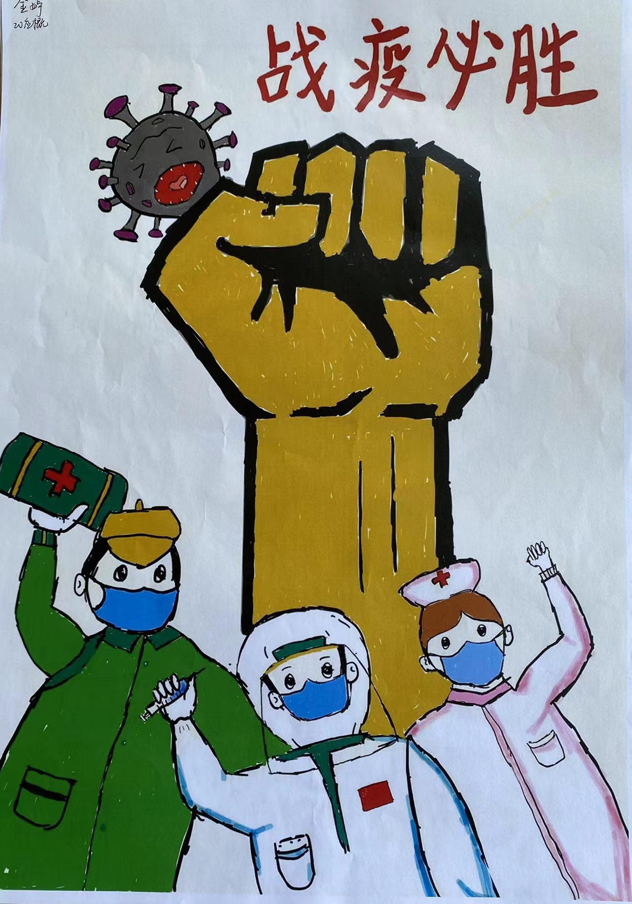 作者研究生第一党支部党员金婷表示:“自新冠疫情爆发以来,一直都是医护人员冲在最前面和病毒斗争,保护我们每一个人,所以想用这幅作品表达对他们的敬佩和感谢之情,希望我们能一起携手迎来摘下口罩随心出行的那一天。”作品里的人物主要指代医护人员和捐助物资、送物资的人,巨大的拳头展现出必胜的姿势,意在我们所有人都会和病毒抗争到底且终将胜利。