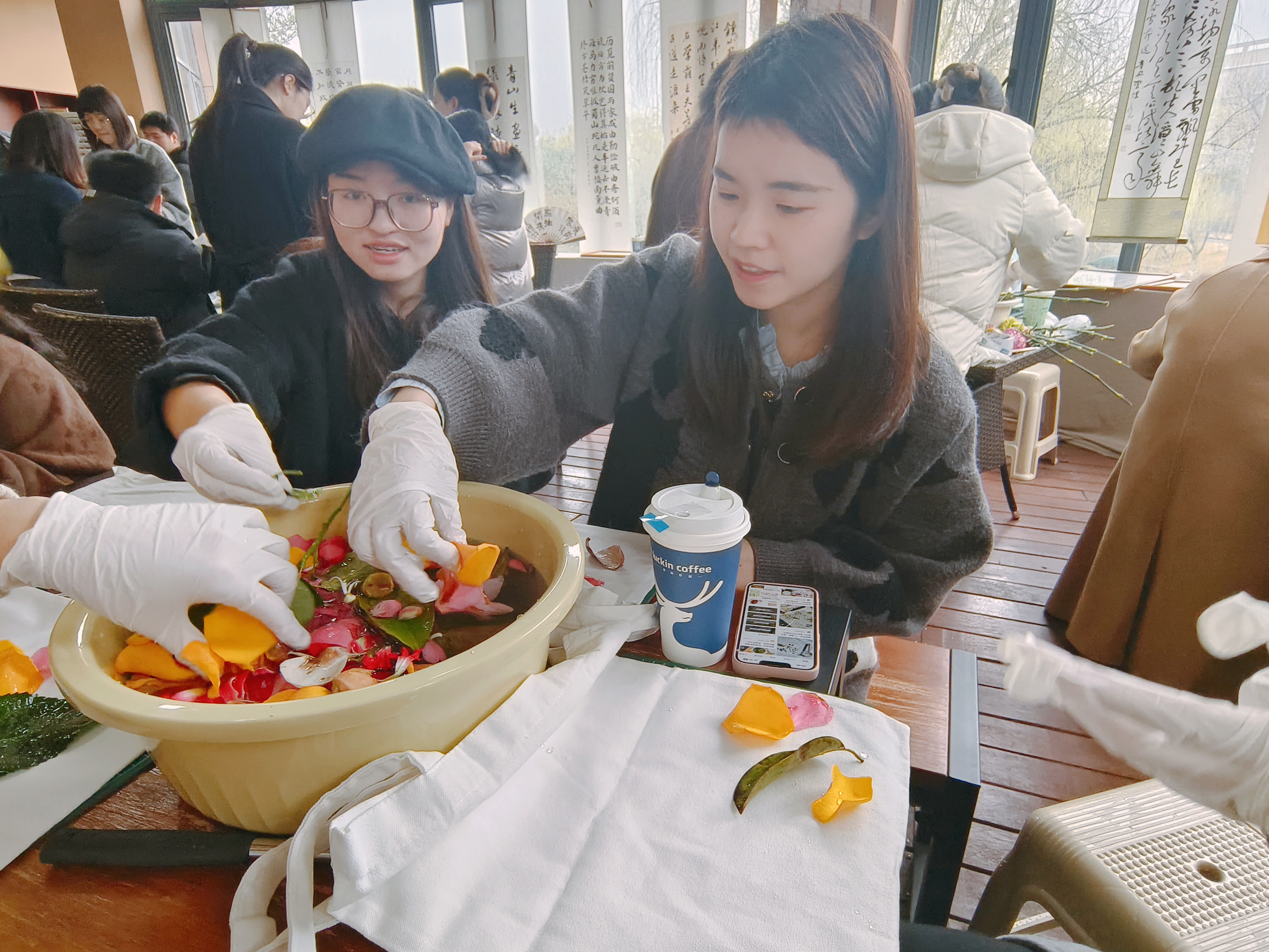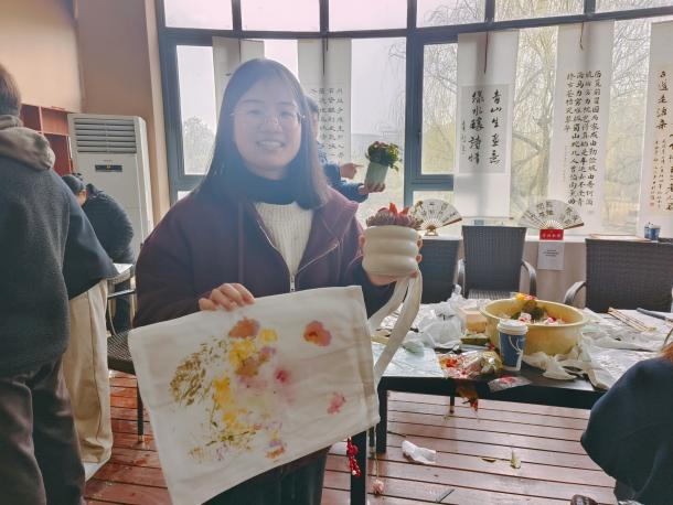辅导员温从乐开展现场教学,解说清洗、固色、晾干、拓印等拓染工序。活动现场,学生们热烈交流、共同动手,一起浸泡绿植和花朵,讨论帆布袋图案,此起彼伏的敲击声在现场跃动,自然的神奇造化在帆布上徐徐舒展。经过近两个小时的创作,20余件作品得以成形展示,每件作品的背后都承载着独一无二的设计理念。活动最后,每一位参与的学生领取了精心准备的绿植盆栽,让大家把春天带回宿舍,活动在欢声笑语中圆满结束。