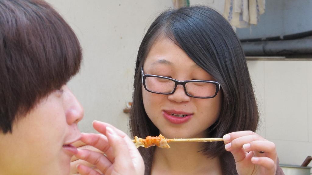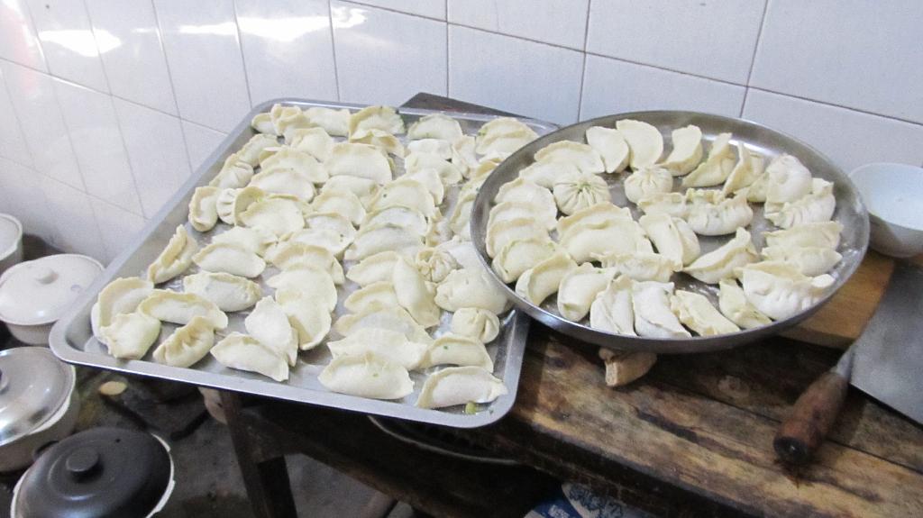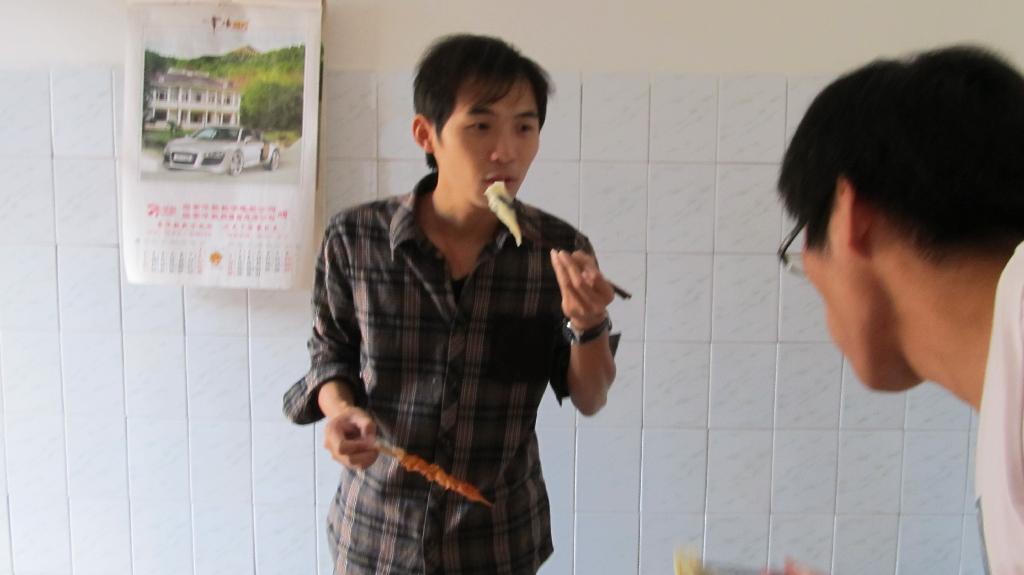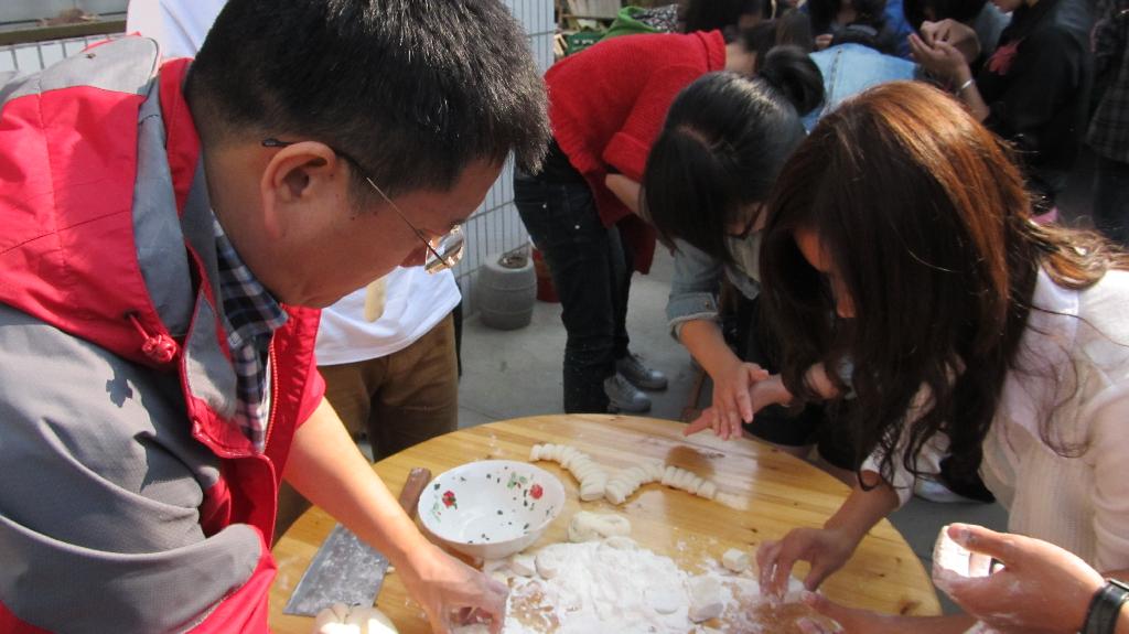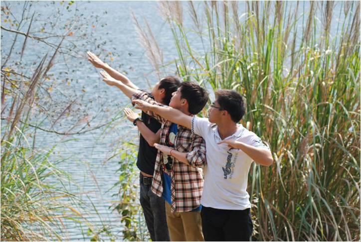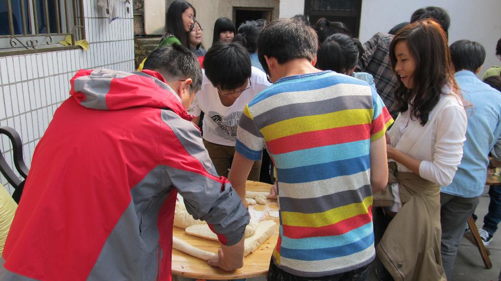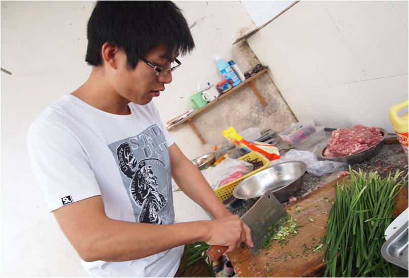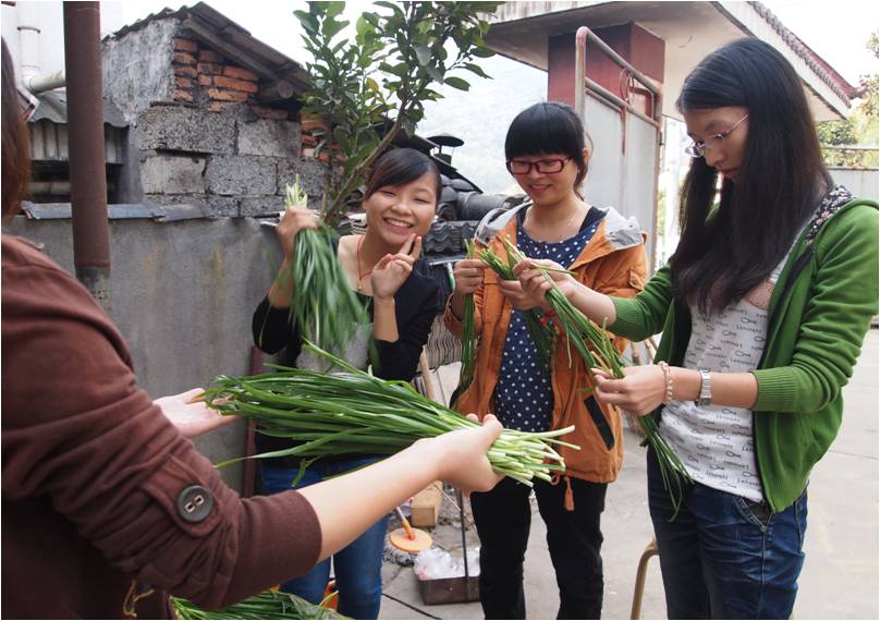 第二天清晨从窗外传来了剁馅儿的声音,那是因为我们要自己动手包饺子。有第一次和面的,有第一次把啤酒瓶当扞面棍的,有第一次扞饺子皮的,也有第一次包饺子的。同一锅出的饺子可谓千奇百怪形态各异,大家抢着吃着,津津乐道,没过三分钟就被洗劫一空。当勤劳的同学还在院子里包饺子时,顽皮的同学早爬山上摘桔子去了,回来得意洋洋的诉说着一路的风景。中餐是老板娘亲自下的厨,让我们美美地享受了一桌地道的农家菜,特别是韭菜炒土鸡蛋,鲜黄的色泽岂是城里的鸡蛋所能媲美!