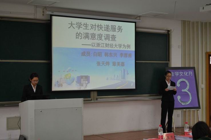 第四届新生科研创新项目报告会,这是每年数学文化月的重要活动之一。参加此次报告会的一共有22个新生小组,他们在上个学期确定选题和设计调查方案,利用课余时间发放问卷进行数据采集和分析,最终撰写出调研报告。在报告会上,各个小组代表依次上台进行5分钟的PPT展示,他们用缜密的思维,精炼概括的语言向大家介绍了论文的大体思路,随后评委则对他们的报告进行提问与点评,整个过程紧张、激烈又精彩纷呈。这些项目内容丰富,有的紧扣大学生生活实际,如关于选课制度、团书馆资源利用情况的调查,有的则关注社会民生和时事热点,如关于杭州市全科医生运行模式、杭州市定制公交发展前景的调研等,充分体现了同学们思考、分析问题的能力以及洞察社会的敏锐视角。