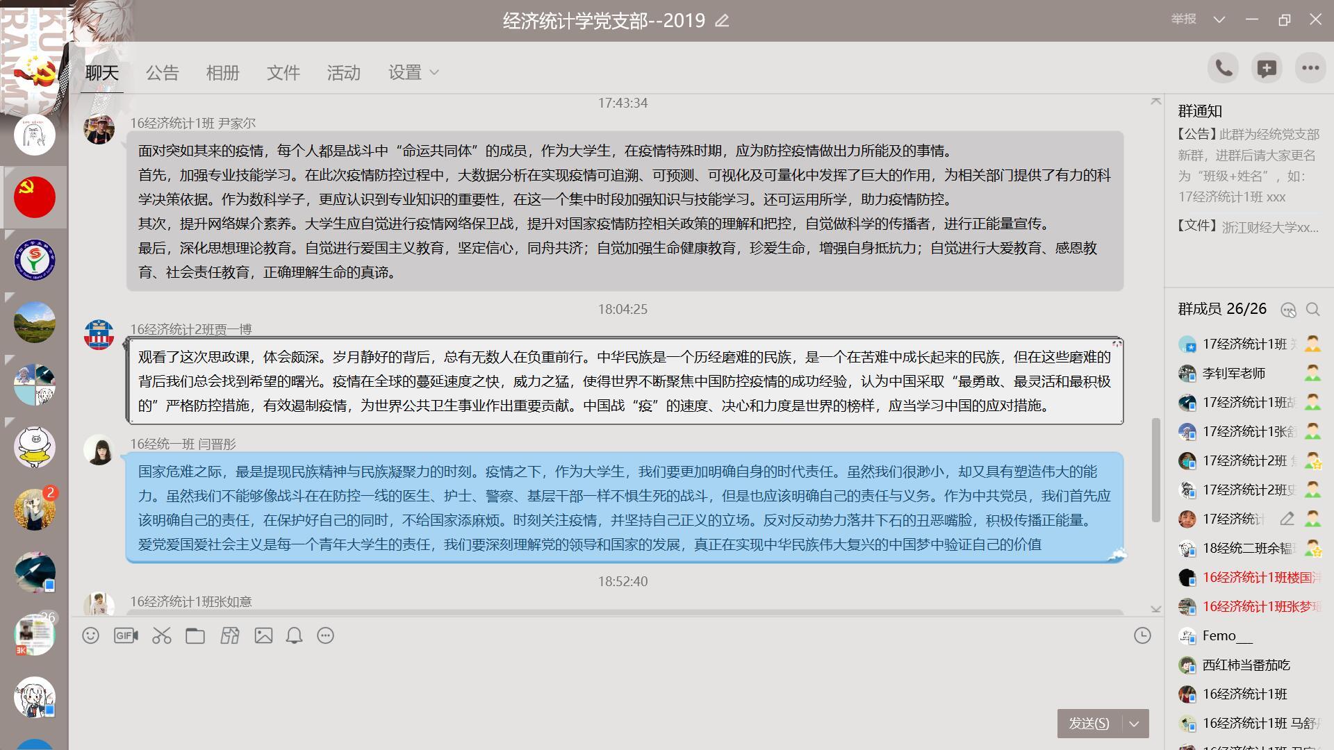 共6个支部、23个班级,900余名师生共同观看了思政大课堂。观看结束之后,研究生党支部以《发挥制度优势,坚决打赢疫情防控战》为主题开展了线上讨论,大家多方位剖析了当前国家应急管理制度、医疗保障制度等在这场疫情防控中发挥的作用,深入讨论了如何继续发挥制度优势,彻底打赢疫情防控战。经济统计本科生党支部以《逆行青春》为主题,分享了疫情防控战中许多青年的优秀事迹,讨论了如何提高大学生的社会责任感和爱国主义精神。应用统计本科生党支部以《战“疫”家书》为主题,收集了在这场人民战争中医务人员、社区工作者、志愿者等以各种形式书写的家书,讨论了这些家书中体现的中国精神。数学系本科生党支部则以《关于抗击疫情中的中国数据》为主题,整理了抗击疫情过程中的相关图表、动态数据分析视频等,以数据为有力证据,证明了中国在抗击疫情过程中的巨大投入,以及科学防控的效果。盘口分析