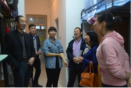 党总支书记杨辉煌老师,副院长邱瑾老师,党总支副书记周君兴老师,辅导员李钊军老师在新生辅导员助理向秋行的陪同下走访了5幢和20幢大一学生宿舍。
