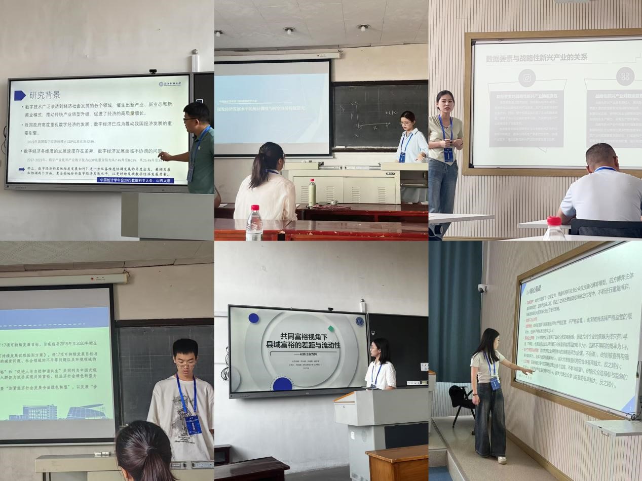 洪兴建教授应邀主持“收入分配与共同富裕”分会场,刘波教授应邀主持“机器学习与预测统计”分会场。谢笑盈老师作题为《非平衡数据的类交叠测度及抽样修正》的学术报告,博士研究生祁垒、朱学博、田婧茹、张飞扬、余文俊、刘佳丽分别作题为《中国省域数字经济协调发展水平测度、时空特征及驱动因素》《银发经济发展水平的统计测度与时空分异特征研究》《数据要素驱动战略性新兴产业发展的影响研究》《兼容还是对立:扩大中等收入群体的生态效应研究》《公众参与碳排放数据核查的四方博弈》《共同富裕视角下县域富裕差距与流动性分析》的学术报告。