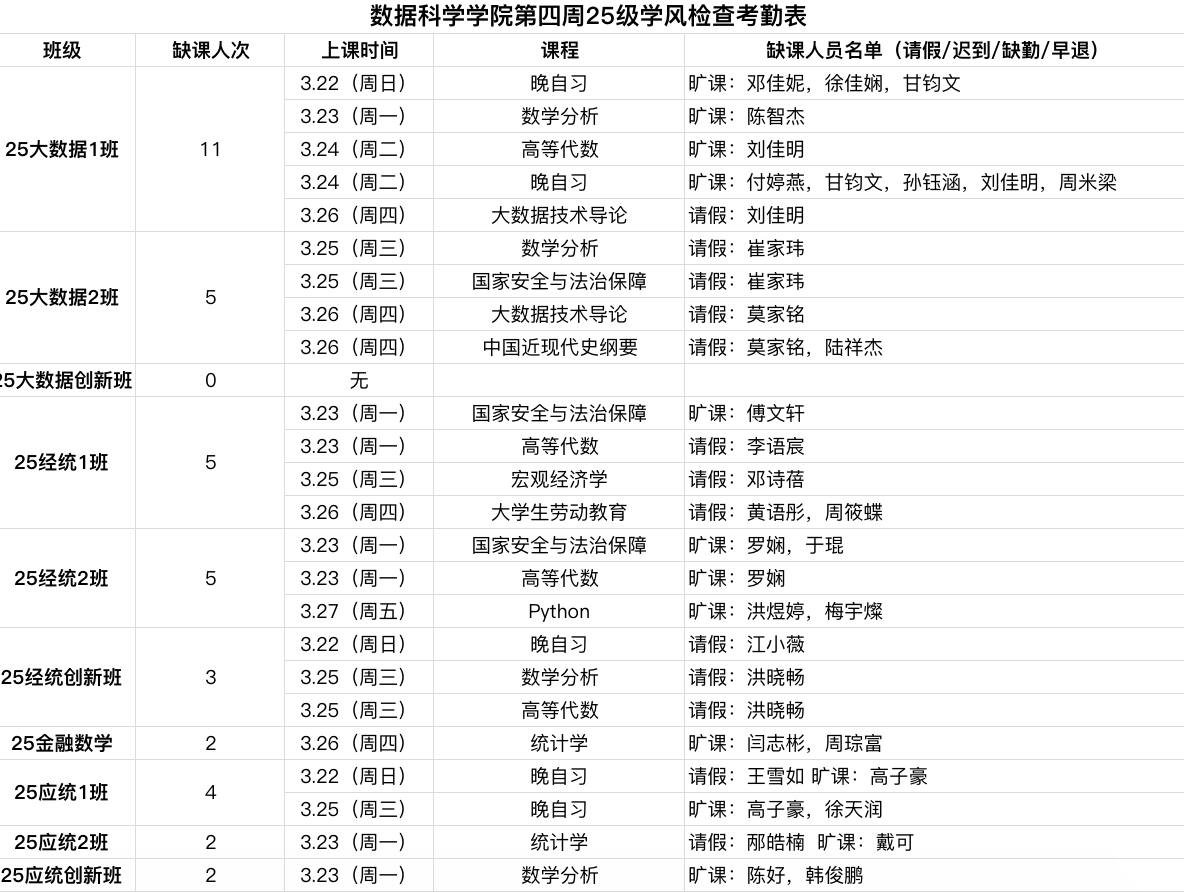 盘口分析 学生工作办公室开展新学期第4周学风督察工作,对本科生各班级的学生前排就座情况,课堂考勤、纪律及听课情况等进行检查,现将本次检查结果通报如下: