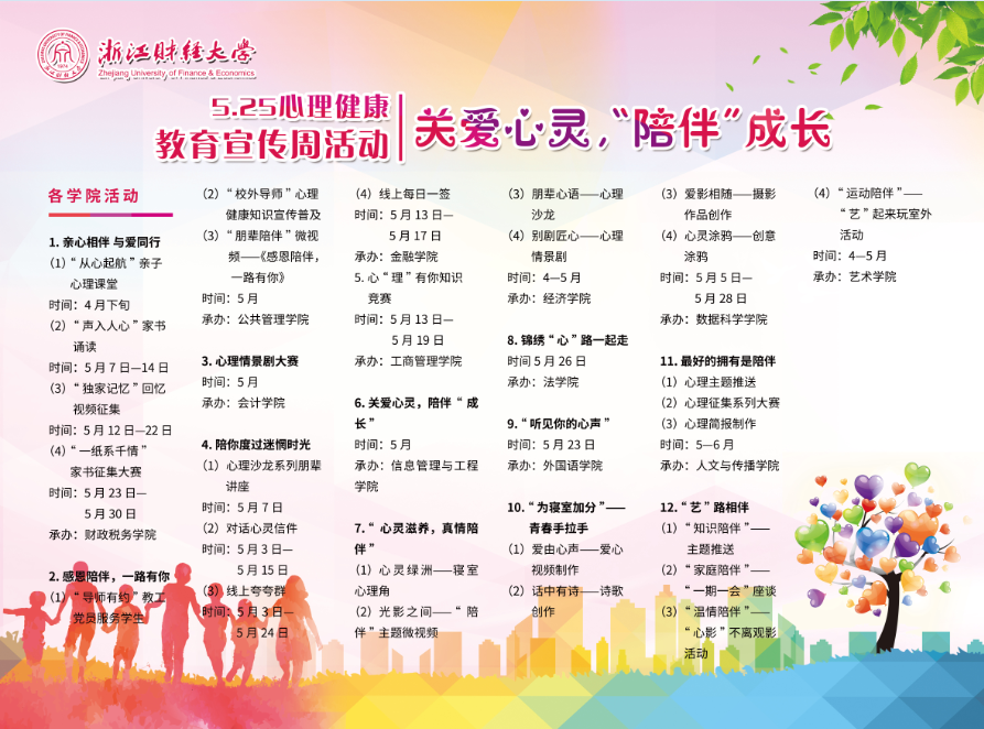 为普及心理健康知识,宣传心理健康意义,帮助广大同学树立正确的心理健康观念,深入推进“三个七”心理育人质量提升工程,营造和谐健康的校园氛围,特开展2019年5·25心理健康教育宣传周活动,现将活动内容公布如下: