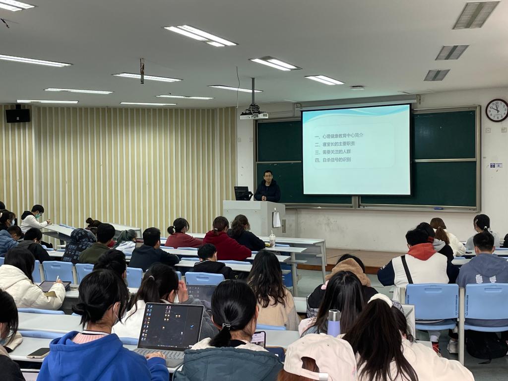 校心理健康中心副主任徐飞以解决心理问题为导向,从心理健康教育中心简介、寝室长的主要职责、需要关注的人群和自杀信号的识别四个部分展开讲解,为解决同学们的心理问题提出可行的措施,提醒大家要关注自身心理健康,发现寝室同学心理异常情况及时上报。
