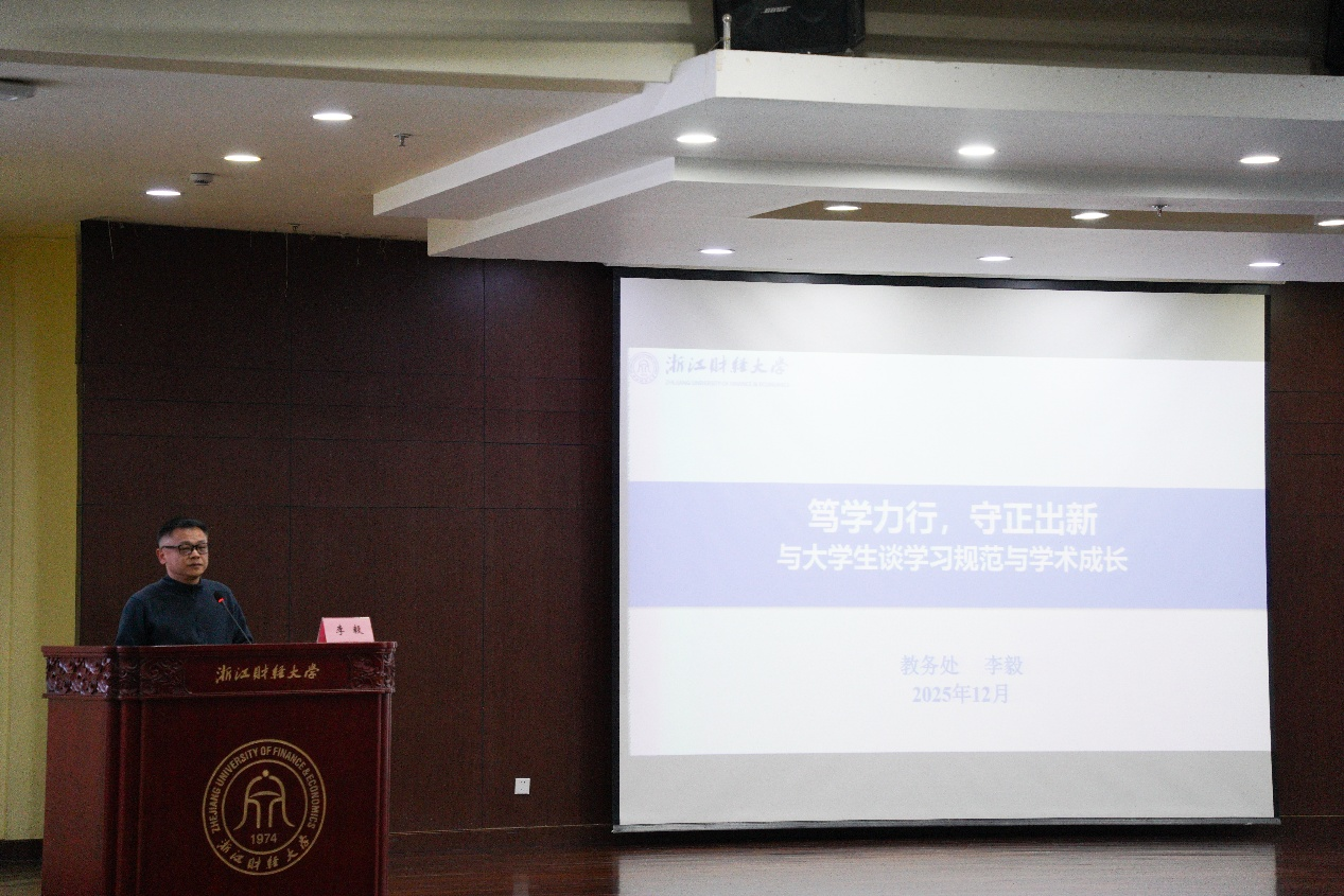 教务处副处长李毅在学术中心第一报告厅为2025级新生带来了一场题为“笃学力行,守正出新:与大学生谈学习规范与学术成长”的讲座。讲座由教学副院长郑松教授主持。