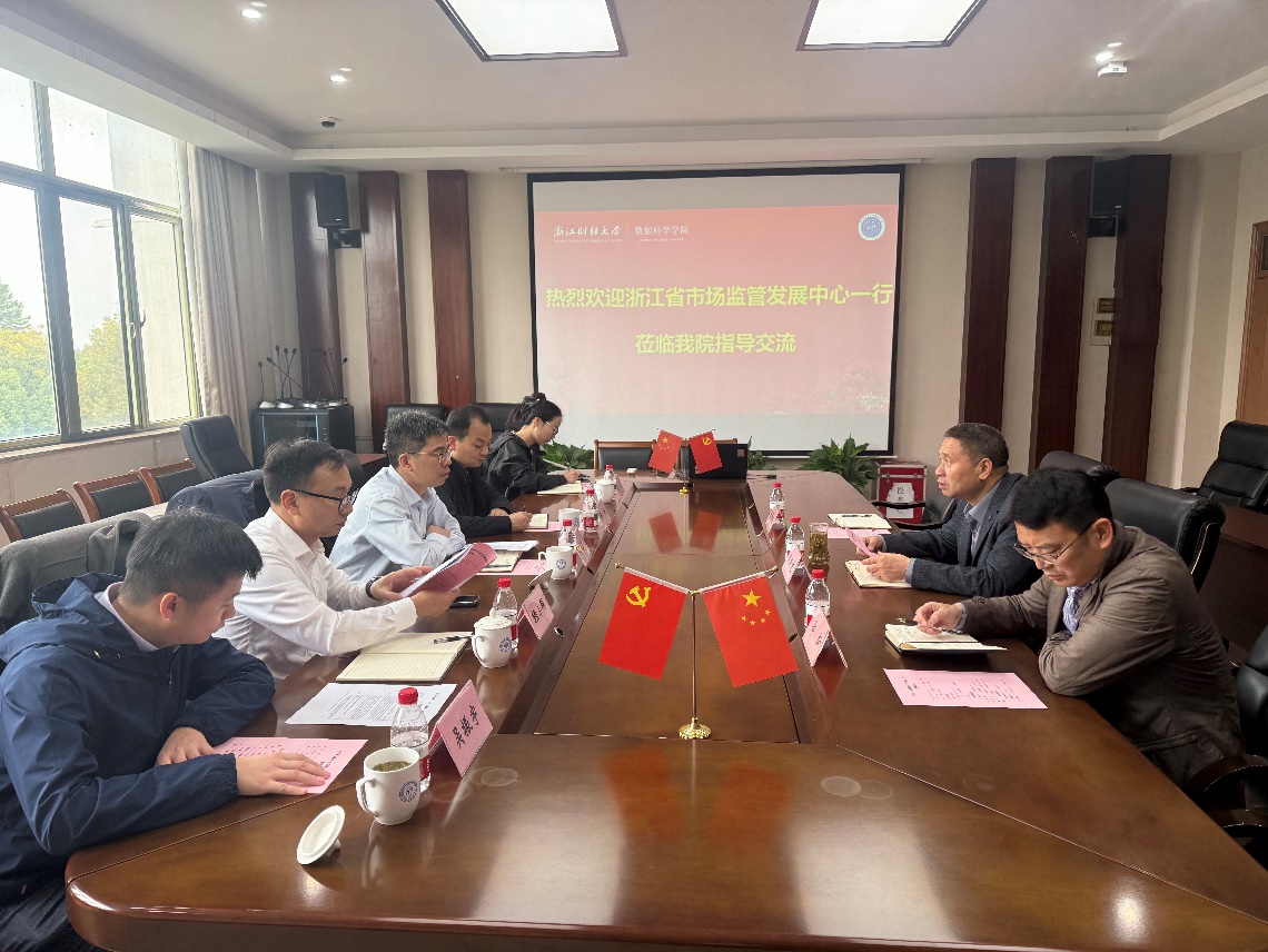 402会议室举行,双方就实验室的申报、建设与管理经验开展调研交流。浙江省市场监管发展中心副主任方道广、综合研究部部长赖小科、党群人事部副部长张涛、研究人员顾妮,数据科学盘口分析
