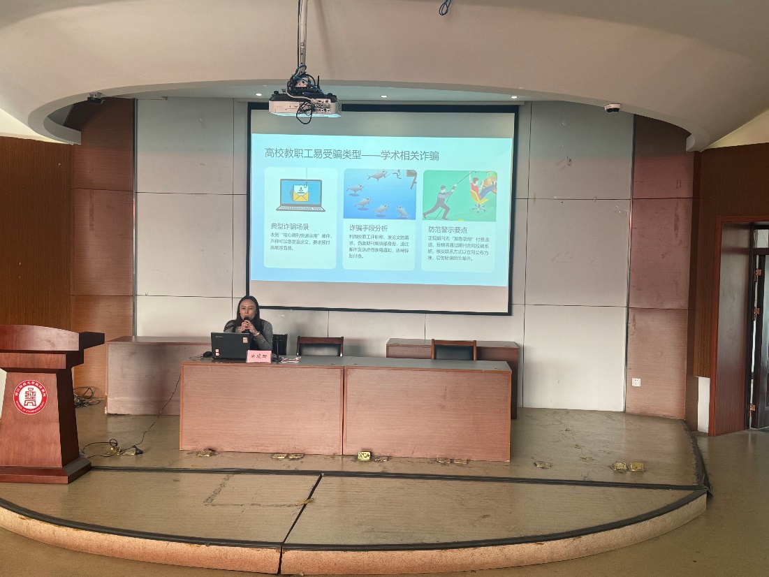 保卫处徐晓珊老师作安全保卫专题讲座,围绕电信网络诈骗、交通安全、消防安全等重点内容展开讲解,切实增强教职工的安全防范意识。