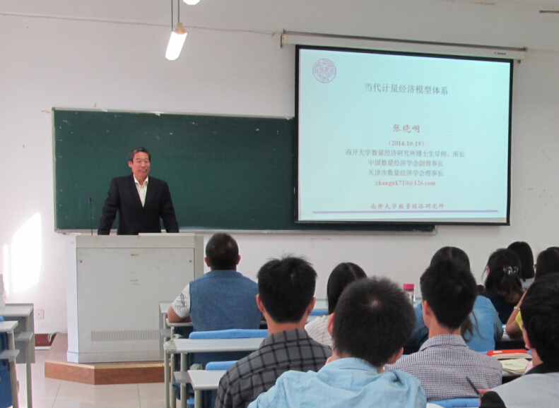 报告会上,张晓峒教授为我们系统地梳理了“当代计量经济学的模型体系”,并从“回归模型”、“时间序列模型”、“蒙特卡罗模拟技术”三个大的方面为我们展开了叙述。从模型的理论介绍到实际应用,张教授为大家做了很好的解析。张晓峒教授的学术报告紧跟当今计量经济学的学术前言,内容丰富,深入浅出,视角独特。讲座结束后,张晓峒教授还与部分师生进行了更加深入的交流,与会师生均感到收获颇多。