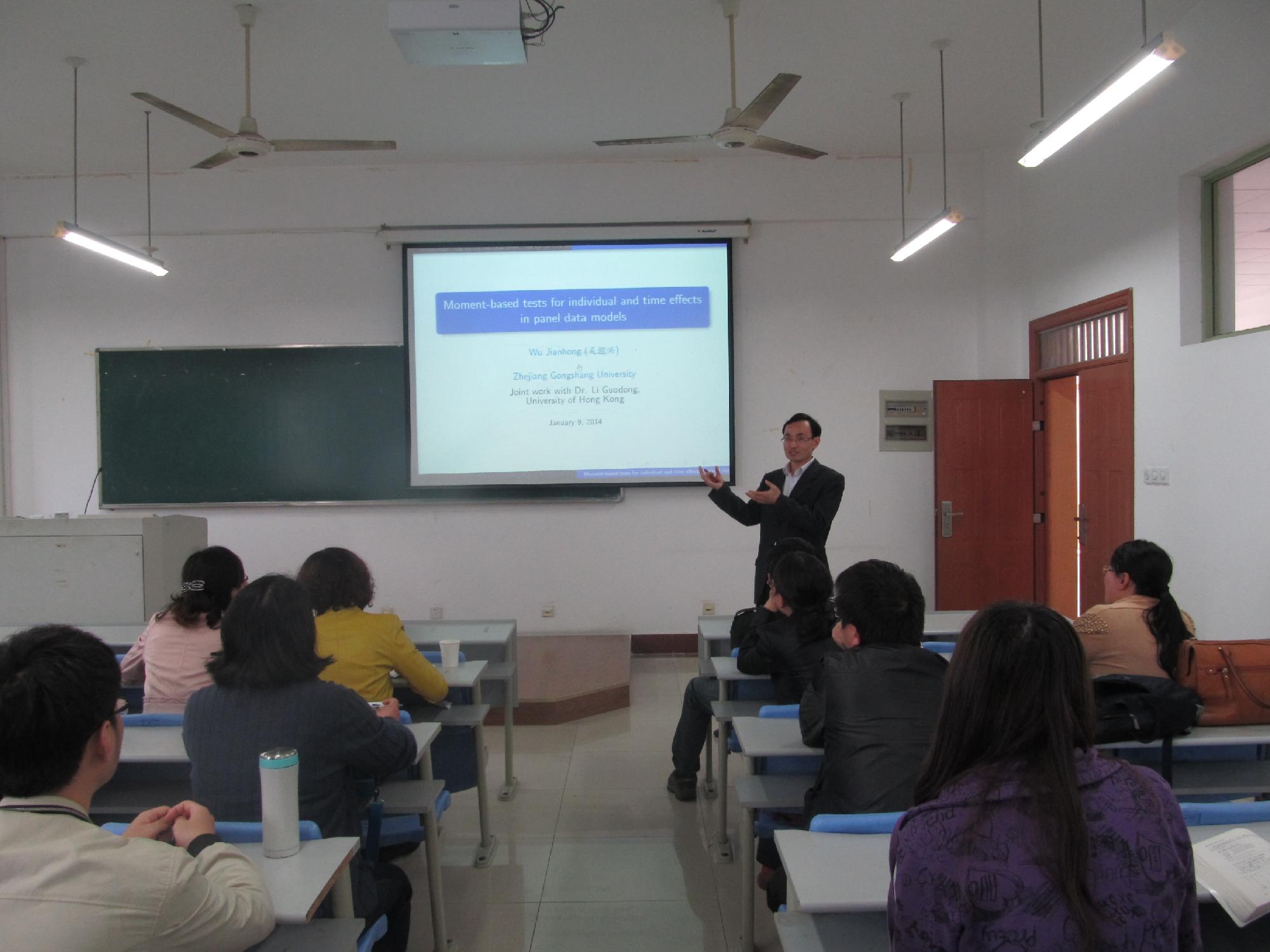 报告会上,吴鑑洪教授首先介绍了研究基于矩检验的动机与由来,随后从个体效应、时间效应及两方面结合效应方面给大家详细讲解了论文中的研究工作。在演讲过程中,吴教授娓娓道来,一步一步给大家介绍了基于矩检验的相关知识并给出了这个检验的优良特性,吴鑑洪教授指出他们的基于矩的检验与F检验是相似的,效果很好。报告期间,吴鑑洪教授针对老师和学生提出的问题进行了详细解答,并在讲座结束后针对相关问题与一些老师进行了长久的讨论,讲座在师生热烈的掌声中结束。