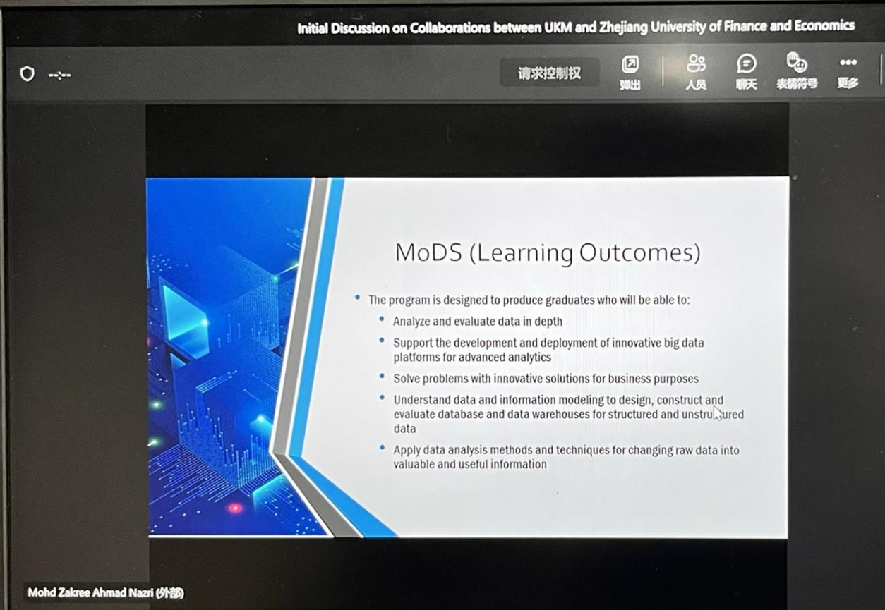 会上,双方围绕拟合作项目展开讨论,就联合培养硕士研究生项目交换意见和建议,初步达成联合建设数据科学硕士研究生项目合作意向。本次交流会为未来与马来西亚国立大学联合培养硕士研究生打下了坚实基础,进一步促进了盘口分析 中外合作办学项目的落地实践。