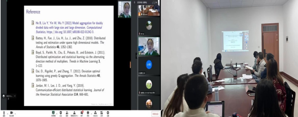 首先,刘妍岩教授介绍了随着信息技术的快速发展,数据量的爆发式增长,海量数据存储和分析越来越重要。海量数据通常具有高维度和大样本量的特点,通常无法存储在一台机器中,因此分析和预测都具有挑战性。随后,刘妍岩教授具体分析了研究中的细节,在存储相对中等样本量的部分数据的每台本地机器上,通过分割预测器来开发模型聚合方法,并开发了贪婪算法。这种新的方法可以有效地分配计算的工作量,并大大降低了通信成本。最后,刘妍岩教授介绍了该方法在模拟和真实数据集的应用,结果均证明了该方法可行性。