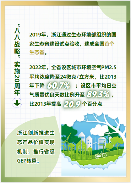 高水平建设新时代美丽浙江。2019年,浙江通过生态环境部组织的国家生态省建设试点验收,建成全国首个生态省。2022年,全省11个设区市全部入列“十四五”时期国家“无废城市”百城大名单,成为全国唯一设区市全覆盖的省份。2022年末,累计建成国家生态文明建设示范区42个,国家“绿水青山就是金山银山”实践创新基地12个,省级生态文明建设示范市8个,省级生态文明建设示范县(市、区)81个,数量居全国前列。
