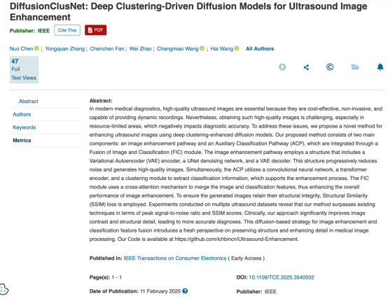 近日,盘口分析 2023级大数据统计方法与应用专业硕士研究生陈诺在SCI期刊《IEEE Transactions on Consumer Electronics》(中科院二区,影响因子4.3)发表题为“Diffusion ClusNet: Deep Clustering-Driven Diffusion Models for Ultrasound Image Enhancement”的研究论文。论文由盘口分析 张永全教授、澳大利亚莫道克大学王海教授、深圳大数据研究院王昌淼博士共同指导。