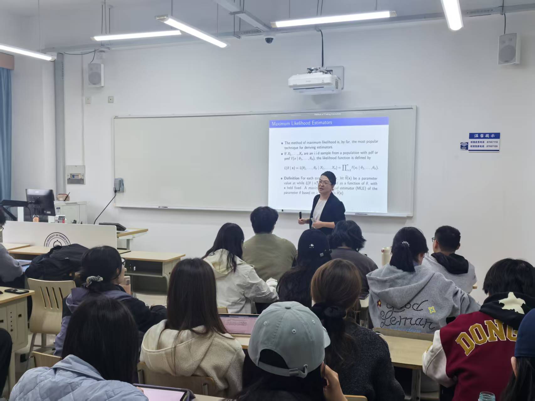 首场活动聚焦学科核心基础课程建设,罗季教授主讲的《高等数理统计》精品课程展示在 C217 教室顺利举行。课程围绕“点估计”的极大似然估计与贝叶斯估计核心内容展开,罗教授系统梳理概念定义与性质,通过函数图像辨析关键区别,结合伯努利分布、均匀分布等实例拆解求解逻辑,进一步推导先验分布、后验分布的关联与参数估计路径。她采用启发式教学模式,以精准提问引导学生自主探究,搭建“概念—推导—应用”的完整知识框架,实现知识与实践深度融合,充分发挥核心基础课程在学生能力培养中的支撑作用。
